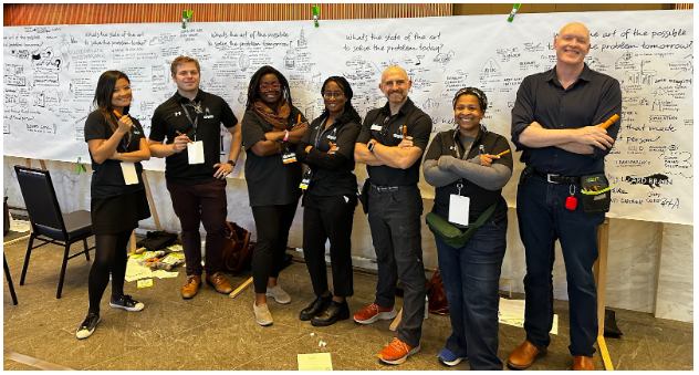 I’d provided graphic recording services for Techstock before, but it was still a pleasant surprise when Aimee, the Techstock executive director, contacted me for their event in October 2024. “Like last year, we’re bringing together special operations folks and techies to work together, mash up ideas, and come up with new innovations,” she said, “but what’s different from last year is that we’re not doing it in breakout groups. It’ll be on November 1, 2024. We’re calling it an ‘operational strategy session.’ About three hundred participants will all work together in the same large room simultaneously. And we want you to graphic record their ideas. Your illustration has to be done at the end of the two hour session, when we’ll invite teams to brief out what they came up with from your graphic recording.”