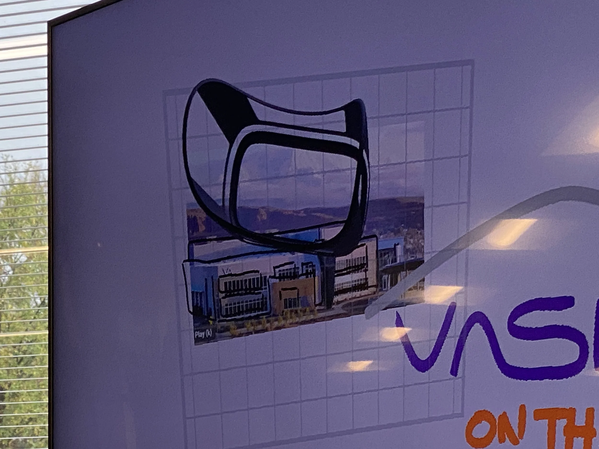 The first thing I did was to mock up the Vasion logo in OpenBrush, an open source 3D painting originally developed by Google as TiltBrush. One of the newer developments is the ability to draw in augmented reality (or “passthrough,” as Apple now calls it.) The Vasion logo floated in the air in our studio: