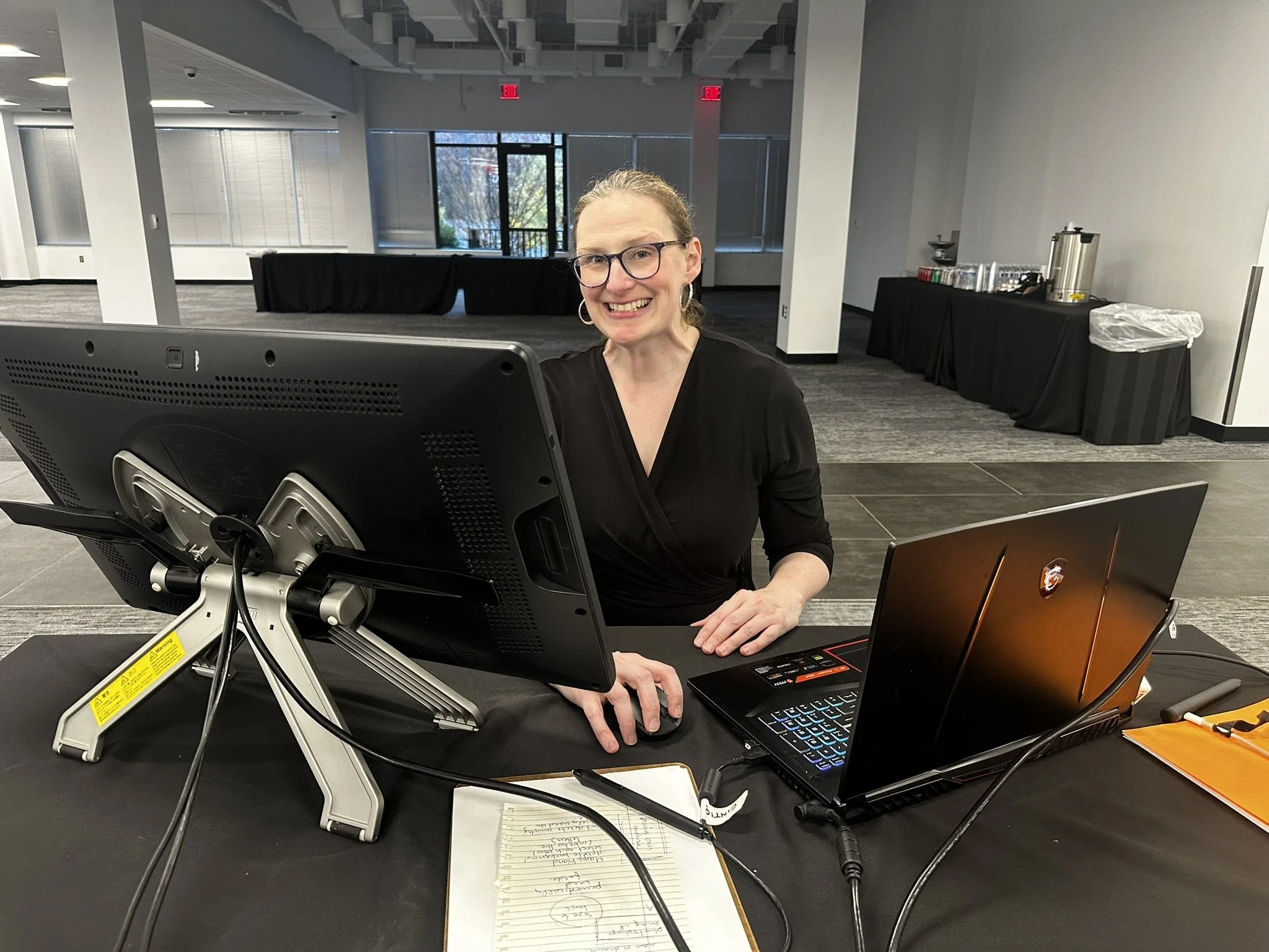 The day of the event, we set up (then had to tear down and set up somewhere else) and connected to a large screen as a second monitor. That was the hardest part: the “smart” screen wasn’t that smart, and the venue’s A/V team had to help us connect it to the gaming laptop.