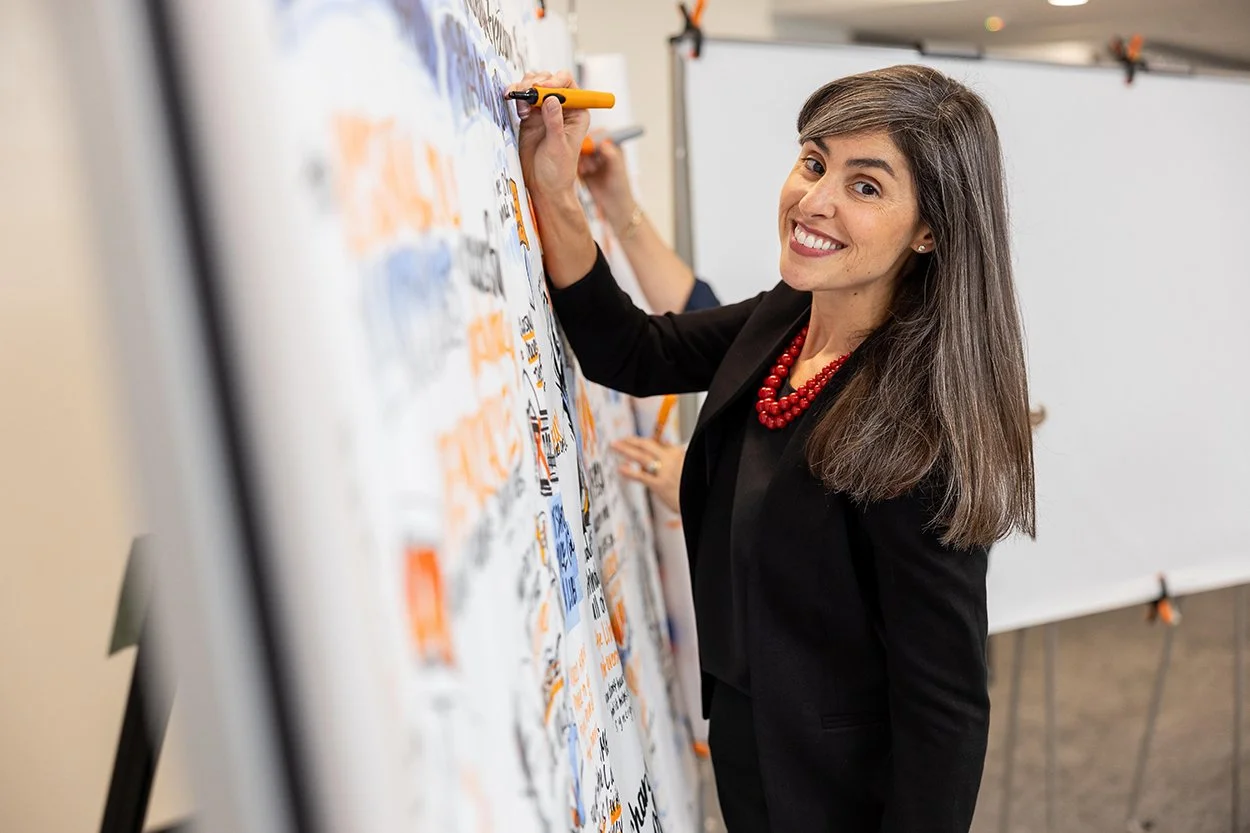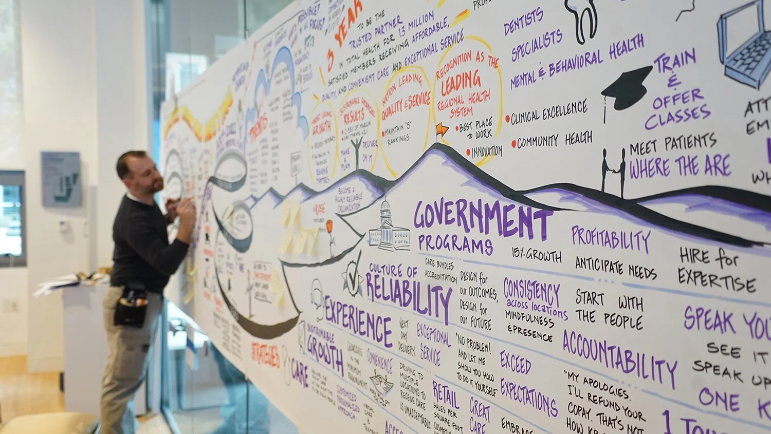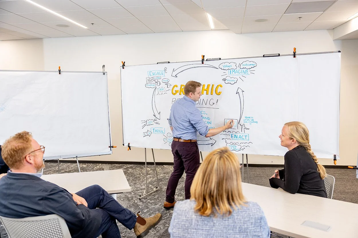 Our visual facilitation (also called graphic facilitation) service leverages large visuals and experiential methods to actively guide participants toward collaborative outcomes. Imagine a meeting space where everyone is actively engaged, creativity abounds, ideas flow freely, and a clear path forward emerges visually. This is the power of visual facilitation in action.